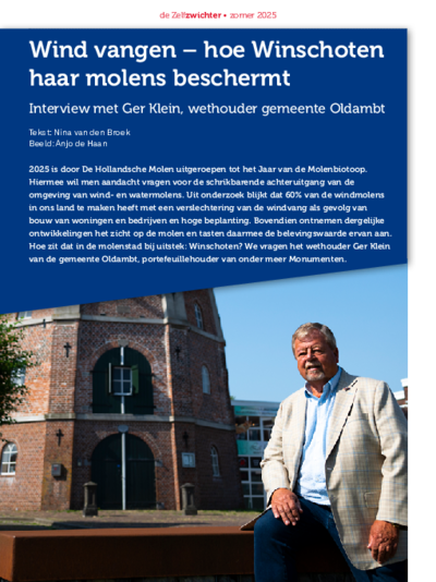 Artikel 'Wind vangen - hoe Winschoten haar molens beschermt : interview met Ger Klein, wethouder gemeente Oldambt' door Nina van den Broek in De Zelfzwichter van augustus 2025
